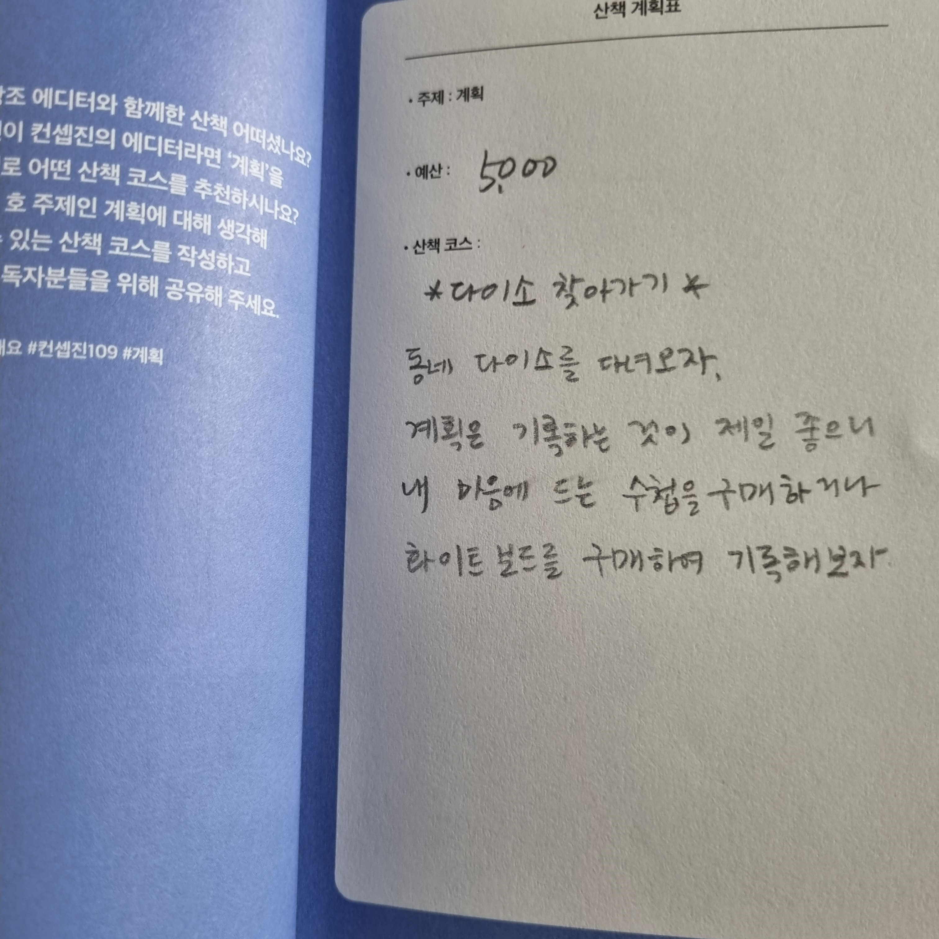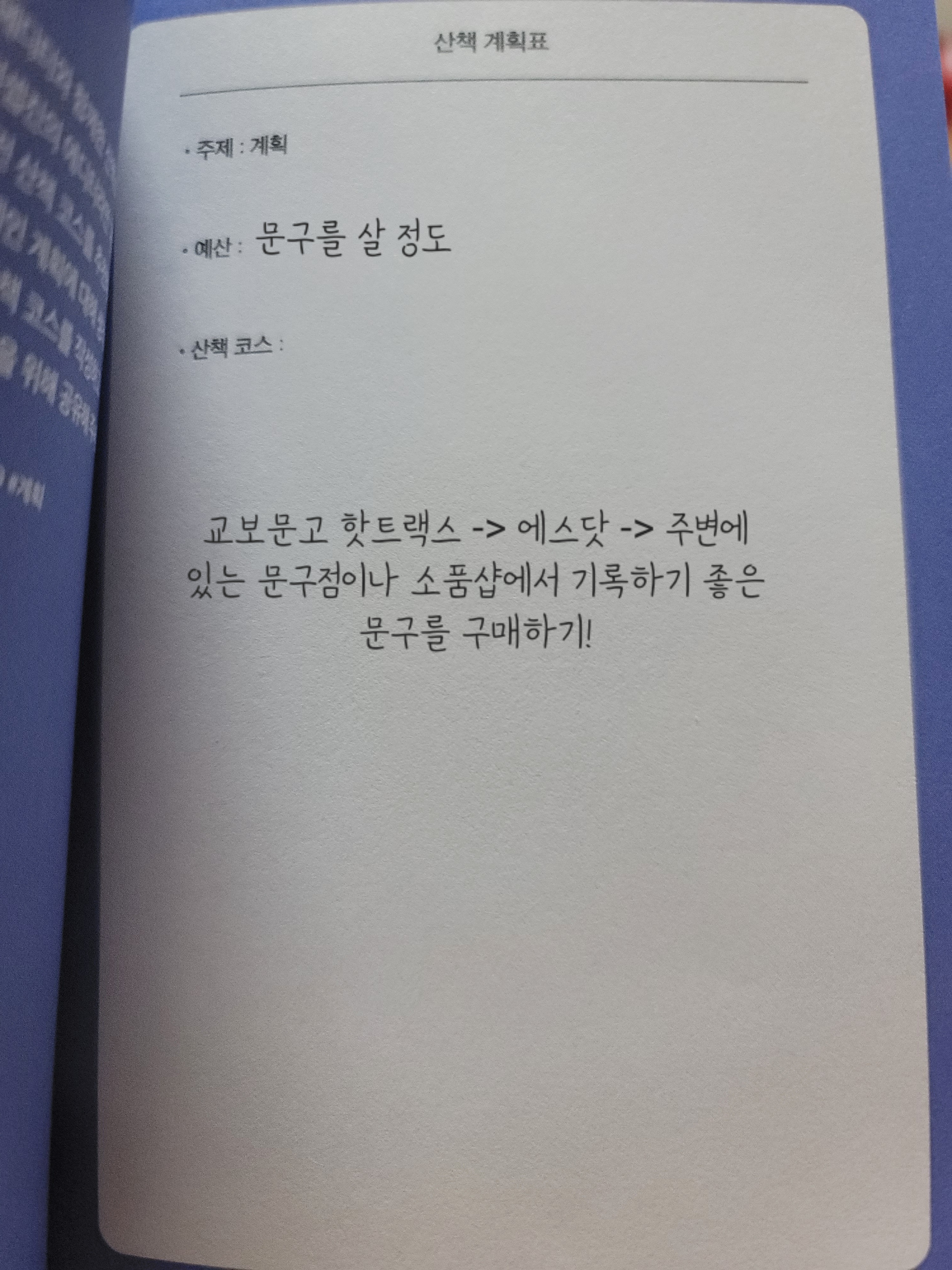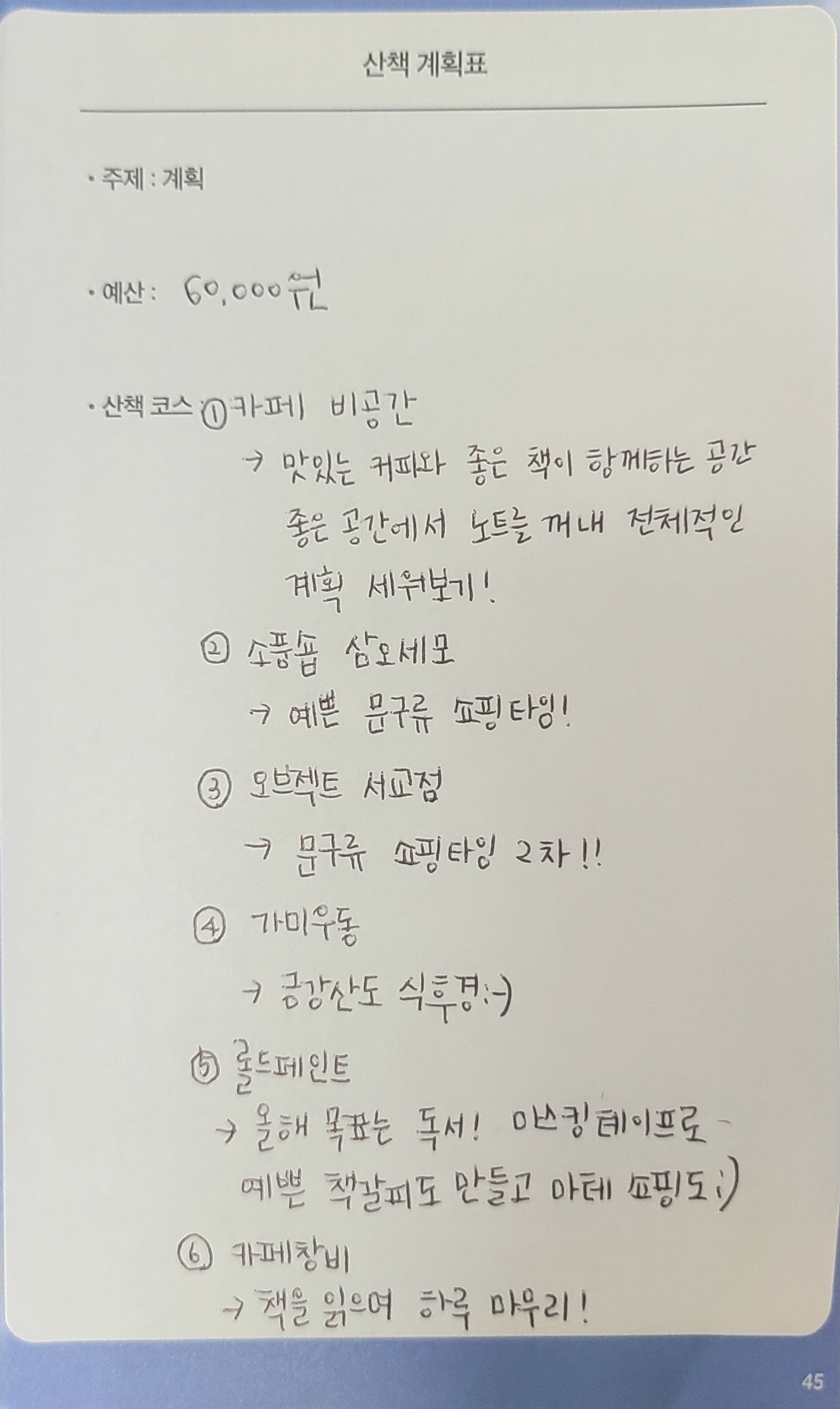저는 책을 좋아하기도 하고, 독서가 목표이기도 해서 책이 중심이 된 계획을 세워보았습니다! (실제로 일요일에 이대로 산책할 계획입니다:-)