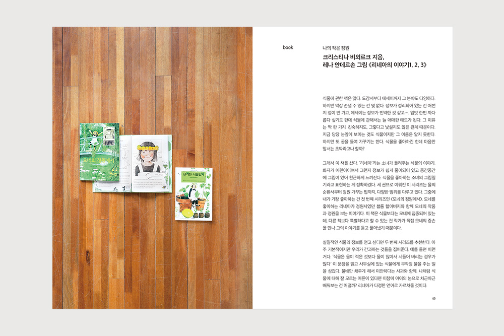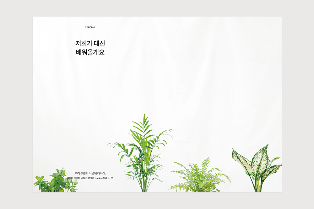 그러다 저에게도 잘 키워내고 싶은 식물이 하나 생겼습니다. 이케아에서 사 온 ‘스파티필름’인데요. 허전한 집에 인테리어용으로 사다 놓은 녀석이 생각보다 잘 자라는 것을 보고, 사무실에도 똑같이 사온 식물입니다. 잘 키우고 싶은 마음에, 녹색창에 식물 이름을 검색해 키우는 법을 찾아보기도 했습니다(누군가에게는 당연했을 일이지만, 저에게는 새삼 뿌듯한 일이었습니다). 그런데 집에서 키우던 아이는 신경을 안 써줘도 알아서 잘 자랐는데, 사무실의 이 아이는 틈만 나면 시들시들해지고, 고개를 숙이는 바람에 하루에도 몇 번이고 살펴보게 만듭니다. 그래서 요즘엔 출근과 동시에 이 친구의 상태부터 살피는 습관이 생겼습니다. 또한 여기저기 자리를 옮겨가며 사무실 안 최적의 장소를 찾아주고 있죠. 문득 이런 제 모습을 보며 이번 호 주제인 ‘당신의 삶엔 식물이 있나요?’라는 질문에 답을 했습니다. ‘네, 있어요.’ 하고요. 비록 아직 서툴긴 하지만, 노력하고 있다고, 그렇게 말하고 싶습니다. 우리 에디터에게, 그리고 여러분에게요.